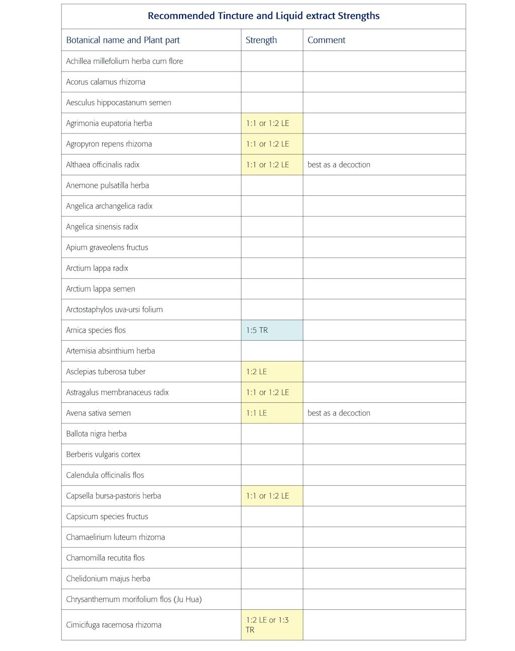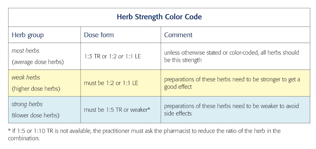 Herb strength and color-code All herbs shown in the Table are average dose herbs unless color coded otherwise, and their tincture strength is 1:3, unless otherwise stated.