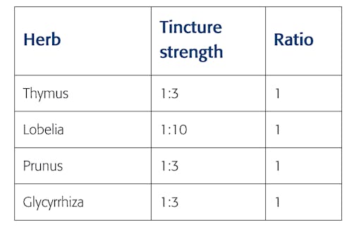 Strength All tinctures are given here are 1:3 in strength, except Lobelia which is 1:10, because it is a strong herb. Ratio In this table, the tinctures of individual herbs are given as ratios (relative proportions to each other in the combination).Thymus 3 as dried herbs