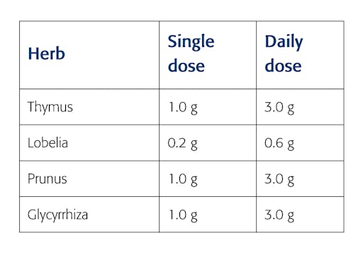 Single dose/daily dose Herb combinations , for example, Thymus 3, are often given 3 times per day. So, if the individual dose of Thymus, Prunus, and Glycyrrhiza is 1 g each, and 0.2 g for Lobelia, the daily dose is 3 g each for Thymus, Prunus, and Lobelia, and 0.6 g for Lobelia.